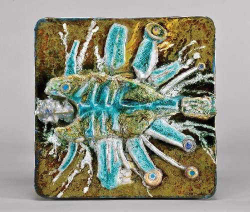 Técnica: placa em cerâmica relevada, policromada e vidrada